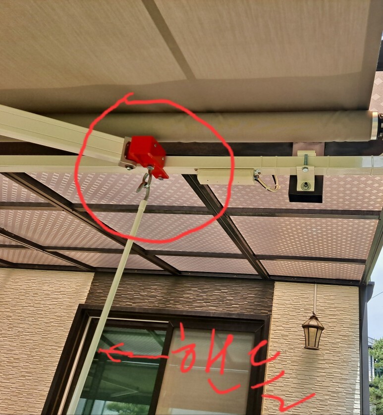 어닝 수동핸들을 돌려 접고